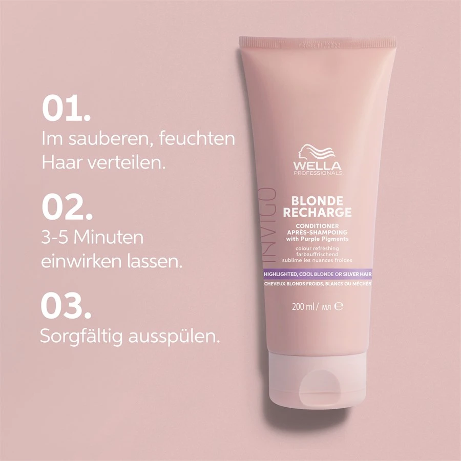 Un blond intense et lumineux – c’est le résultat que le Color Recharge Refreshing Color Conditioner Cool Blonde de Wella garantit. Grâce à ses pigments de couleur, l’effet de couleur sur les cheveux blonds est prolongé et la brillance de la couleur est accrue. L’après-shampooing doit être massé dans les cheveux humides puis réparti uniformément. Le temps d’application doit être compris entre trois et cinq minutes et dépend de l’effet éclaircissant désiré. L’après-shampooing doit ensuite être rincé abondamment. Pour un effet optimal, l’après-shampooing doit être utilisé à chaque lavage de cheveux.