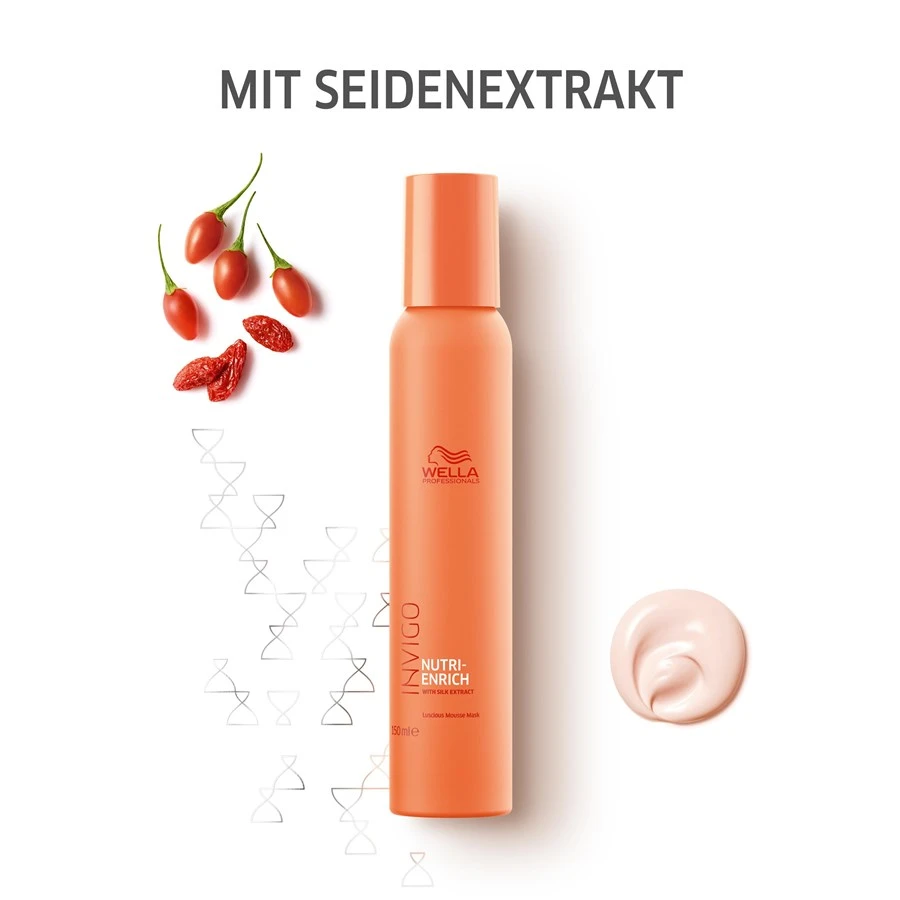 Faites faire à vos cheveux stressés une pause régulière dans la vie quotidienne et choyez leurs fibres capillaires avec le masque riche Luscious Mousse. Ce soin fait effet en seulement deux minutes, et après le lavage, vous pouvez peigner et coiffer vos cheveux comme d’habitude. Pour garder vos cheveux sains et soyeux, appliquez le Masque Mousse Mask avec d’autres produits de la gamme Wella Nutri-Enrich, par exemple avec les shampoing et conditionneur Nutri-Enrich.