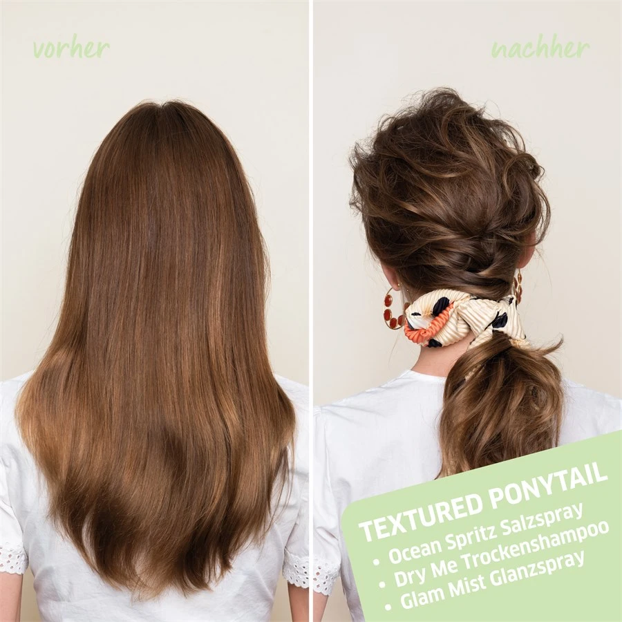 L’Ocean Spritz Beach Texture Spray doit être vaporisé sur les cheveux secs ou légèrement humides puis massé avec vos doigts. Il peut être ensuite séché à l’air libre. Le séchage au sèche-cheveux permet d’obtenir une structure capillaire encore plus douce. Si vous voulez intensifier le look plage, choisissez la crème EIMI Grip Cream de la collection Texture. Cette crème capillaire avec niveau de tenue 3 offre une tenue solide mais flexible avec de la cire de carnauba brésilienne. Frotter une petite quantité de crème coiffante douce dans les mains, puis appliquer sur les longueurs et les pointes des cheveux sur les cheveux secs.